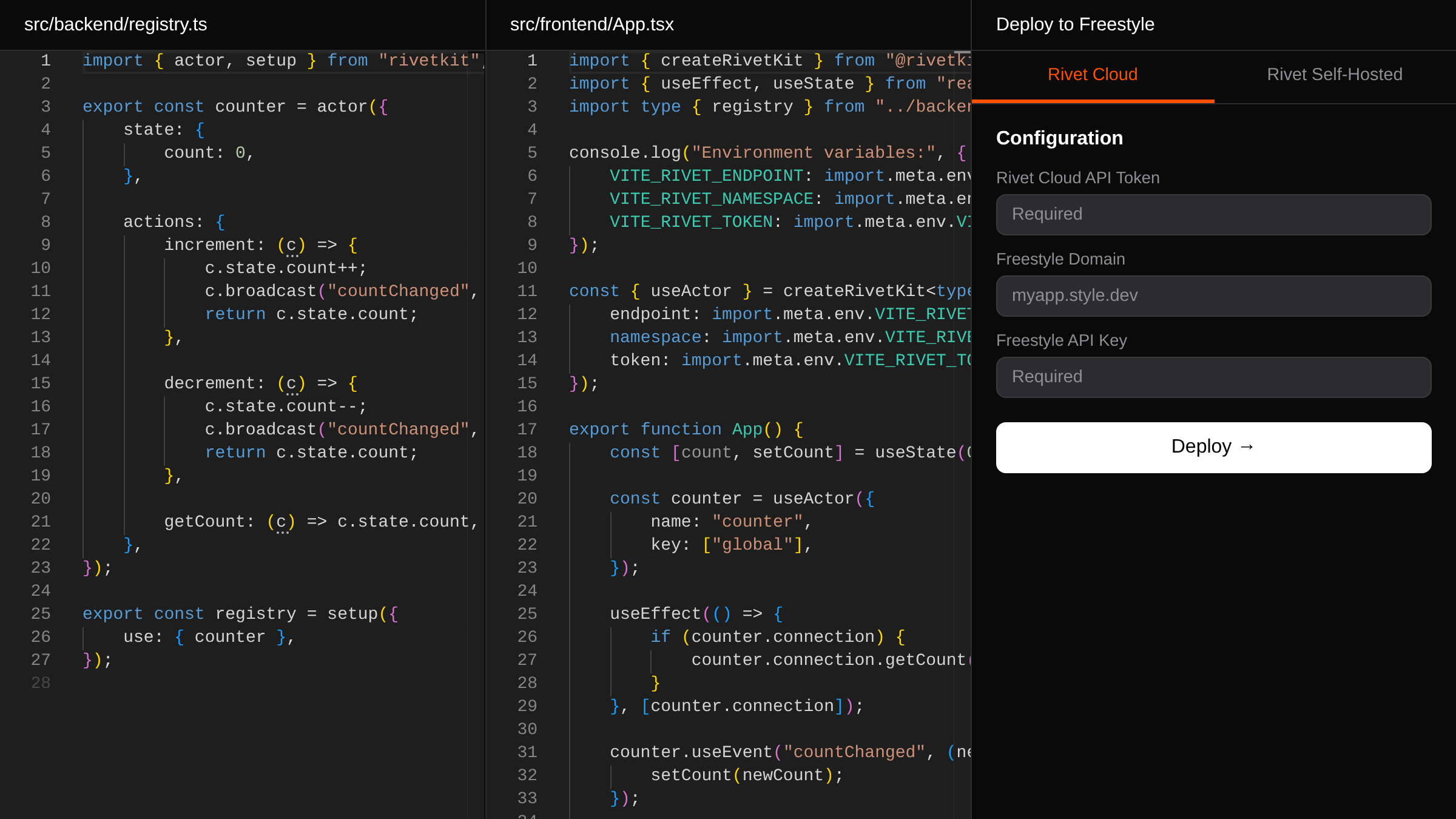 A minimal example demonstrating RivetKit with a real-time counter shared across multiple clients.